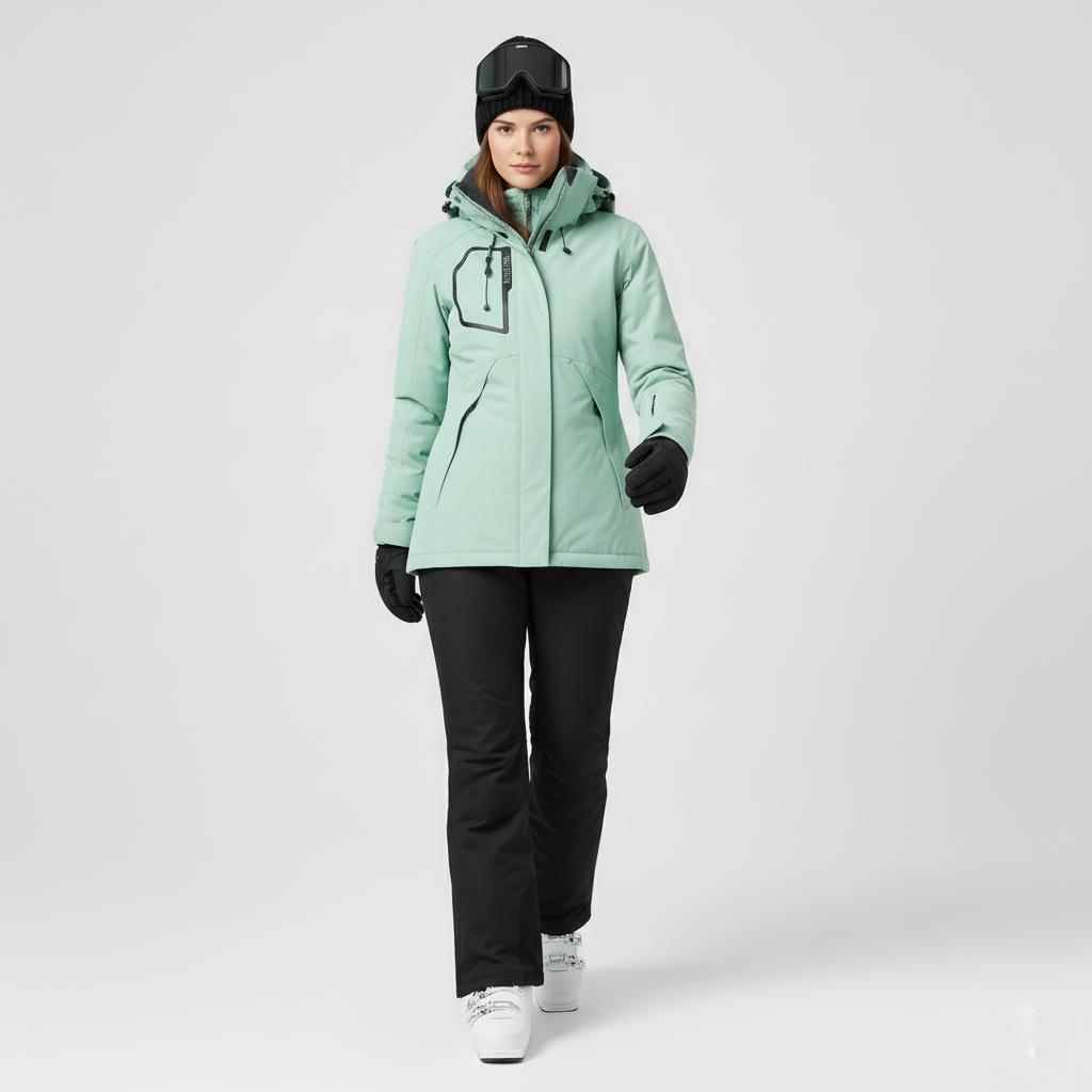 This women’s jacket and pants set is designed as coordinated ski outerwear. The set consists of a jacket and matching trousers intended for use in cold-weather outdoor environments. The jacket features a front fastening, adjustable hood, and adjustable cuffs for fit control. The trousers are designed to be worn as part of a layered outerwear system. This set is suitable for skiing, snowboarding, and other winter outdoor activities.
